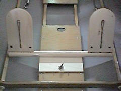 Der Abstand der Pedale zum Sitz lässt sich um ca. 8 cm nach vorn verändern, in dem man den Stemmbock um 180° gedreht einbaut. Allerdings müssen dann die Pedale gedreht und die Steuerleinen mit den Zeltleinenspannern entsprechend verlängert werden. So paßt dann die Vorrichtung auch für Personen bis ca. 2 m Körpergröße. |