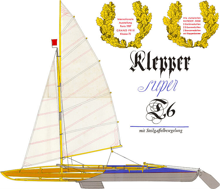 Die neue Klepper-Steilgaffel-Besegelung ist in Verbindung mit dem neuen Kiel-Senk-Schwert, dem neuen Handruder, der verbesserten Vorsegelausrüstung und den Verdecksitzen technisch bereits so durchgebildet, dass die Ausrüstung der Ausstattung einer Rennjolle durchaus gleichkommt. |